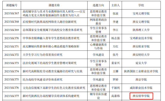 根据《关于公布2021年度陕西高校学生工作精品项目和研究课题立项名单的通知》的文件,学校党委学生工作部蔡亮主持的《三聚三融联动:红色基因融入大学生爱国主义教育实践研究》获得“学生工作精品项目”立项,传媒学院高嘉炜主持的《新时代陕西民办高校辅导员培训体系构建研究》获得“学生工作研究课题”立项。