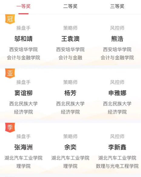 近日,由共青团中央青年发展部主办的第七届“东方财富杯”全国大学生金融精英挑战赛国赛圆满落幕,西安培华学院会计与金融学院的战队技压群雄,问鼎冠军。冠军战队是来自金融工程专业的“浙江徐翔归来”战队,其中,操盘手为金融工程18级的邬和靖;策略师为金融工程18级的王袁澳;风控师为金融工程18级的熊浩同学;指导教师为金融工程专业张元芳老师。