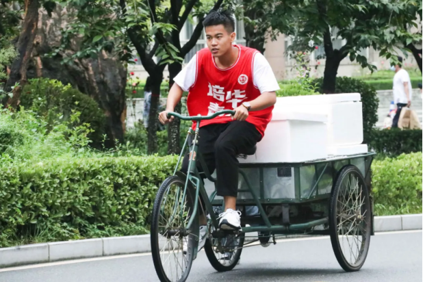 他们不怕吃苦,尽全力把行李帮新生运送到宿舍,在雨中奔波为新生搬行李的他们,就是这雨天中的一把伞。