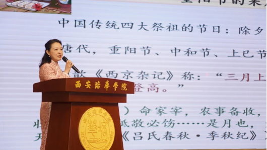 张静老师作了题为《秋日胜春朝——中国古人的重阳赏秋活动》的报告,讲述了我国古代文人志士对重阳节的种种感悟及他们当时身处的国家国情。