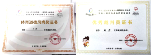 学校体育学院吕晶、时君、赵曼曼三位老师在残特奥会赛场上凭借着扎实过硬的专业技能,忠于职守的敬业精神,严谨踏实的工作态度文明裁判,展现了高水平的业务及职业素养,得到了赛会组织的认可。其中,吕晶老师获“道德风尚奖”,时君老师获得了“优秀裁判员”称号,充分彰显了培华体育人认真负责的良好工作态度。