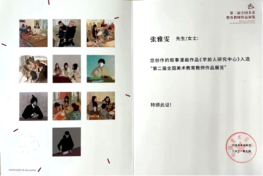 近日,中国美术家协会举办的“第二届全国美术教育教师作品展”在四川美术学院美术馆开幕。此次展览面向全国高校教师征稿,包括中国画、油画、版画、水彩/粉画、雕塑、综合材料、视觉传达设计、环境艺术、服装设计、工艺美术、影视动画、漫画等13个大类,初审稿件4049件,共有243件作品入选本次展览。西安培华学院人文与国际教育学院学前教育系教师张雅雯的叙事漫画作品《学前人研究中心》入选本次展览。
