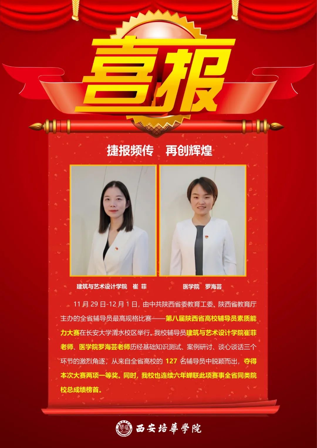 11月29日-12月1日,由省教育工委、省教育厅主办的第八届陕西省高校辅导员素质能力大赛在长安大学渭水校区举行。学校建筑与艺术设计学院崔菲老师、医学院罗海芸老师历经基础知识测试、案例研讨、谈心谈话三个环节的激烈角逐,两位选手从来自全省高校的127名辅导员中脱颖而出,双双夺得大赛一等奖。