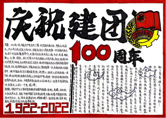 2022年,欣逢中国共产主义青年团成立100周年,在百年的奋斗历程中,中国共青团始终与党同心,与党同行,为庆祝中国共青团成立100周年,社团团工委主办,社团管理部积极动员各学生社团广泛参与“风雨飘零辟新路,百年艰辛载荣光”多种形式的主题团日活动。其中包括海报及手抄报征集,下面一起欣赏一下同学们的作品吧。