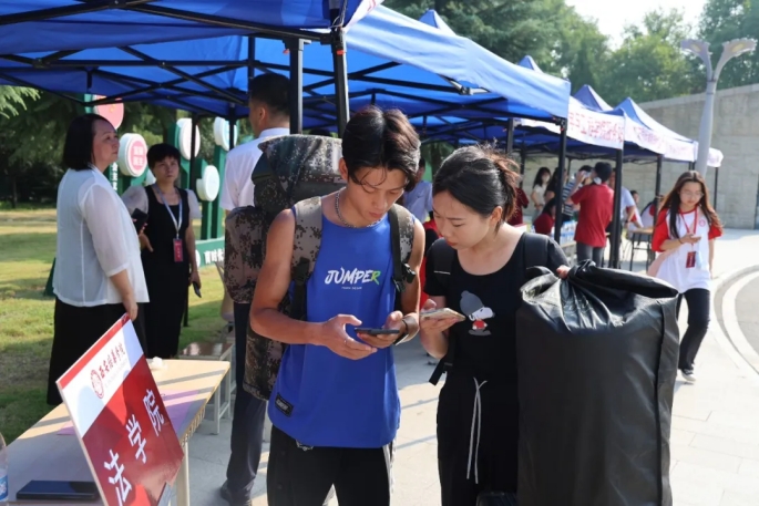 大批的志愿者,帮新生一起扛行李、提供咨询服务,陪同办理报到手续,还有摆渡车全天侯为学子提供服务。