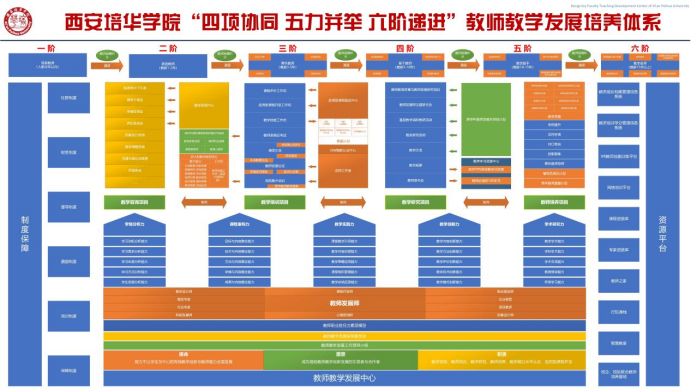 ——创新教师发展体系,全方位提升教师教学能力。“四项协同 五力并举 六阶递进”教师教学发展培养体系以西安培华学院教师职业胜任力素质模型为基础,以教师教学的五种核心能力培养为着力点,在教师发展师团队的引领下,通过开发四大类共计二十余项教师发展项目,全方位、不间断地对教师开展递进式培养。经过多年实践,学校入选教育部教育质量评估中心《高校教师发展中心建设优秀案例》。