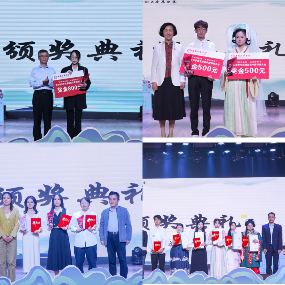 颁奖典礼的舞台上,刘锋书记为一等奖获得者张奕萱颁奖,刘越莲教授为二等奖获得者许语亭和冯海缤颁奖,徐惠主任和雷学军院长为三等奖获得者杨思语、王文睿和韦梓怡颁奖,权勇太部长和王萌助理为优秀奖获得者折凡凡,刘佳仪,宋姿睿,刘伟,屈玉笛和刘雨欣颁奖。获奖同学手捧奖杯,眼眸映出的笑意折射出他们的荣光与梦想。此刻梦想与现实交错,诗心与荣耀交织,这段经历将在选手们的记忆中化作璀璨星光,照亮他们未来前行的道路。
