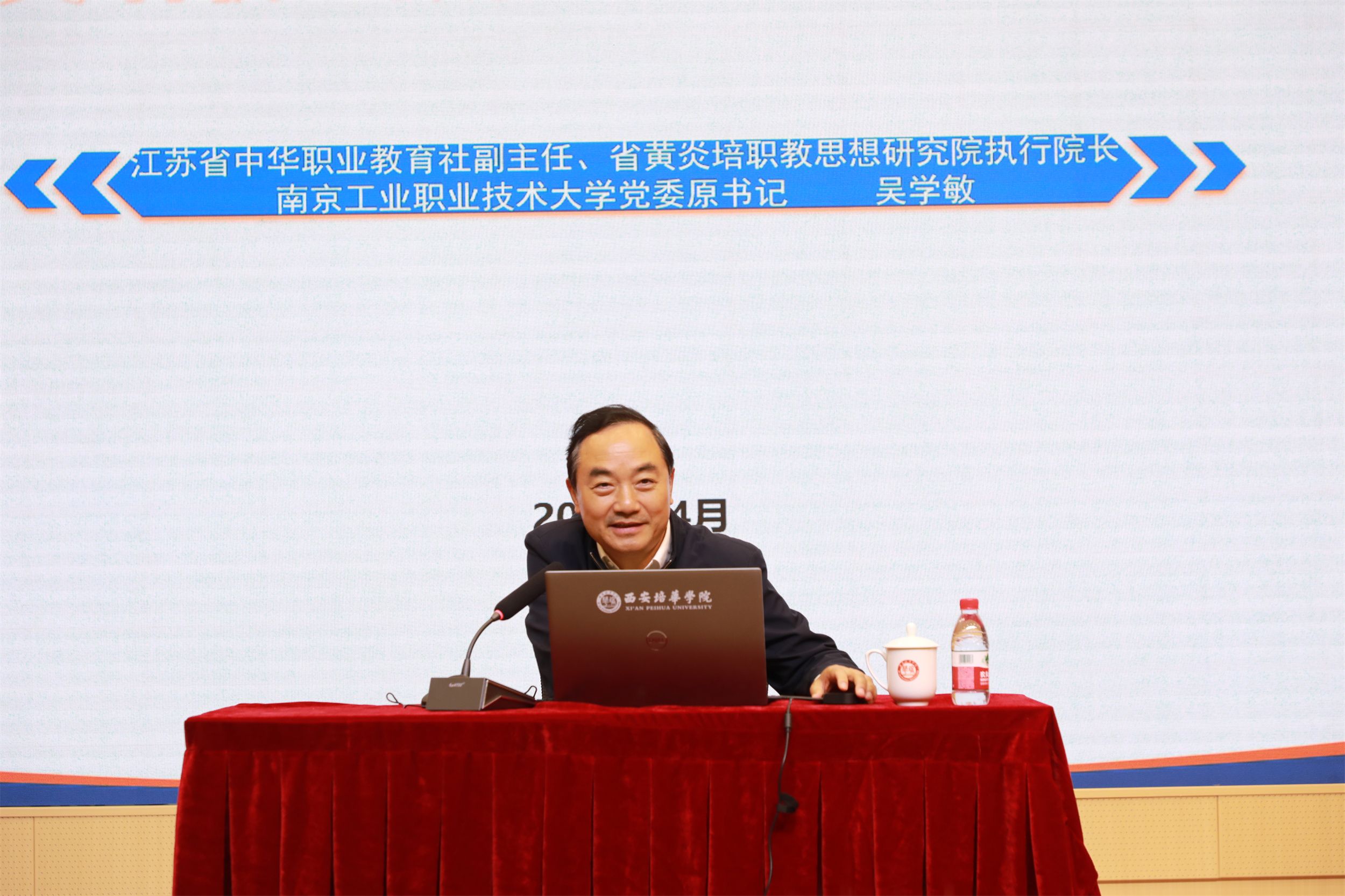 会议第二阶段“职教大讲堂”由西安培华学院副校长、学术委员会主席罗新远主持。江苏省政协委员、江苏省中华职教社副主任、江苏黄炎培职教思想研究院执行院长、南京工业职业技术大学党委原书记、研究员吴学敏作题为《黄炎培职业教育思想的传承与创新》的报告。