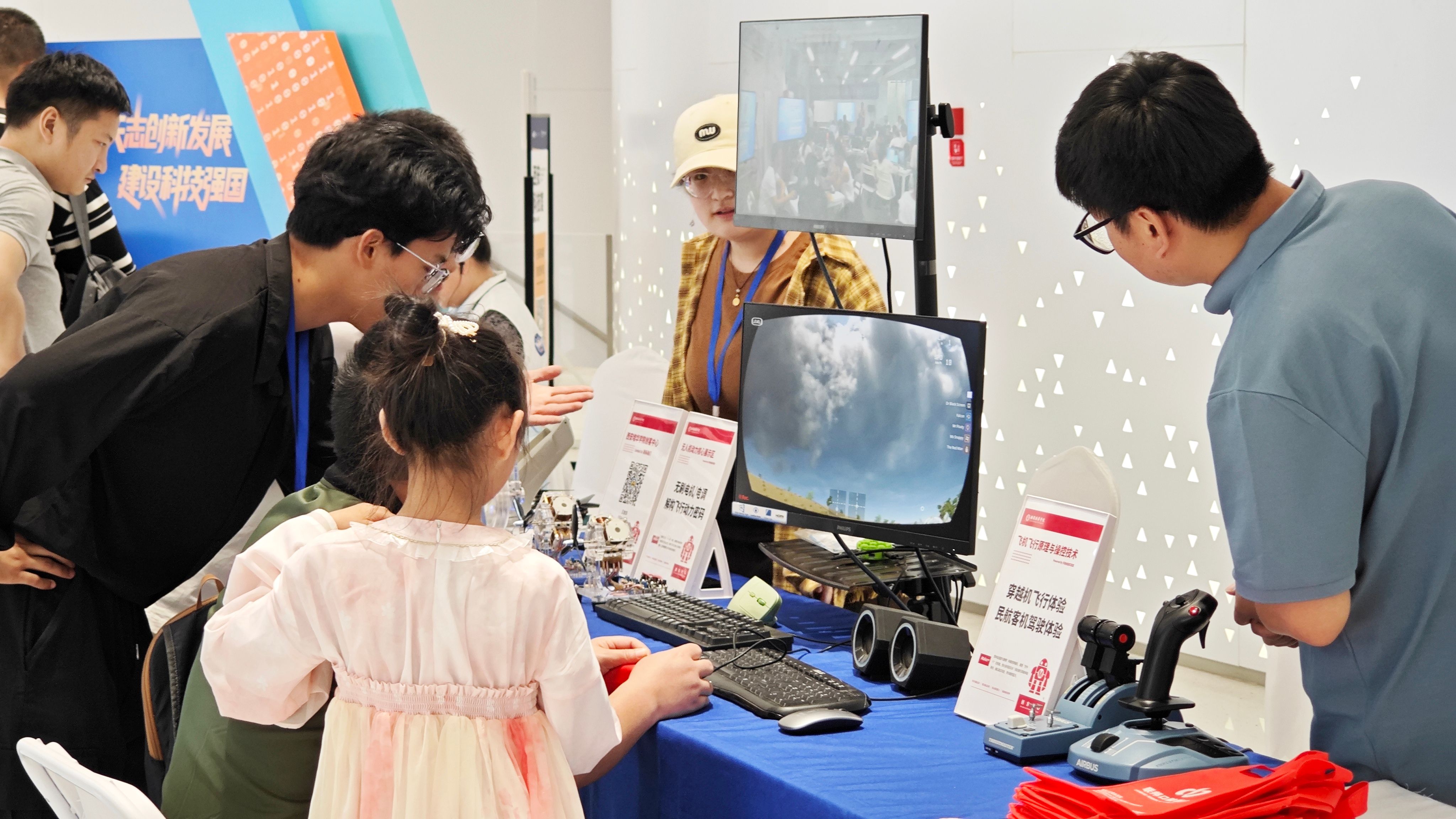 具备高速机动性能与多场景作业能力的穿越机无人机备受瞩目,师生们结合实物展品与展板视频,通过通俗易懂的语言向观众讲解各部件零件的功能与飞行原理;模拟飞行体验区气氛热烈,参观者借助专业操控设备完成虚拟无人机的障碍穿越任务,在趣味互动中感受航空科技的独特魅力。
