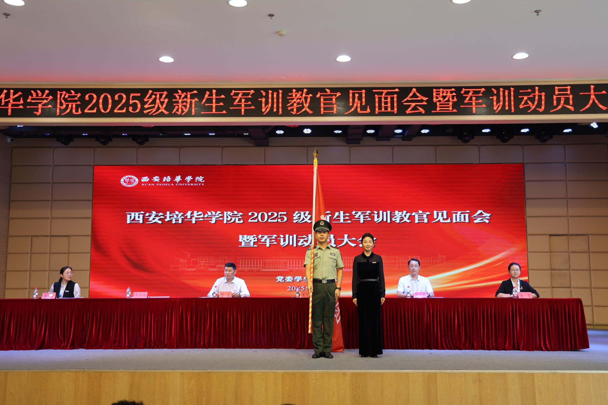 9月1日上午,西安培华学院2025级新生国防教育动员暨教官见面会在恒友楼多功能厅顺利举行。校党委副书记、副校长姚文静、党委副书记蔡亮出席会议,党委学工部部长权勇太、军训团团长严保利、党委学工部副部长杨媛、校团委书记董莹,各二级学院党委(党总支)书记(副书记)、全体新生辅导员及2025级全体新生军训教官们参加本次见面会。大会由党委学工部朱林鹏老师主持。