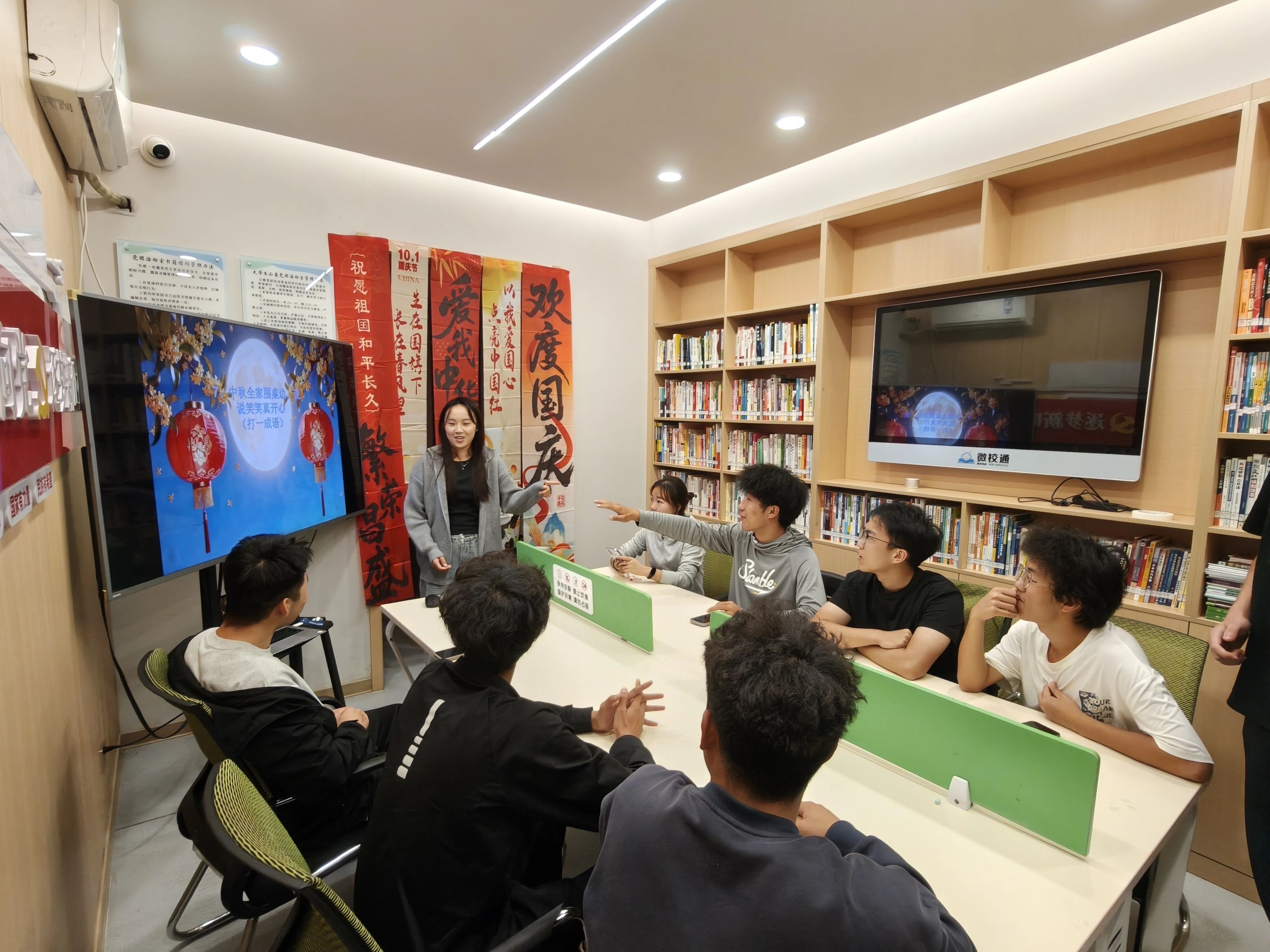 会计与金融学院、体育学院在双节期间举办猜灯谜主题活动,灯谜内容涵盖中秋典故、爱国诗词与校园生活等。同学们或凝神思考,或热烈讨论,活动现场欢声笑语,传统文化在趣味互动中悄然传承。