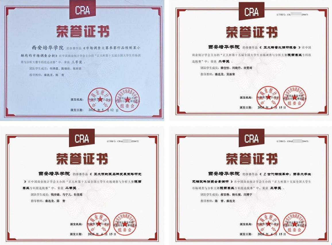 在专科组竞赛中,何泽晨、陈瑞洁、张丝语团队凭借作品《预制菜小酥肉的市场调查分析》突出重围,荣获国家级三等奖,创下学院在该赛事中的历史最佳成绩。同时,雒佳怡、刘晓丹、宋雯琦团队作品《正大蜂蜜水调研报告》,钱诗涵、马宁儿、杜佳瑶团队作品《正大预制菜品牌发展策略研究》斩获省级二等奖。郝首燕、杨长城、闫博宁团队作品《Z世代糖控革命:西安大学生无糖饮料消费全景调研》获省级三等奖。在本科组竞赛中,由赵亚楠、李昕逾、李晓龙、李宇龙团队完成的作品《从“舌尖喜好”到“品牌长青”:预制菜的逆袭路》获省级二等奖。刘馨雨、周菲菲、田晓玉、李欣茹团队的作品《卤味新“煮艺”,预制菜卤肉市场调研报告》,刘怡凡、牛淑钰、雷春玲、李婷萍、叶文鼎团队的作品《香酥新主张:预制菜小酥肉消费行为调查报告斩获省级三等奖。