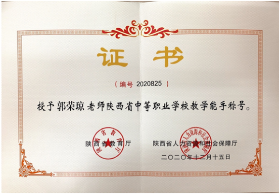 岁月静美,喜讯频传,2020年陕西省教学能手评选工作已落下帷幕,根据陕西省教育厅、陕西省人社厅陕教[2020]194号文件公示,经学校申报推荐、学科评审组集中评议、评选工作领导小组会议评议审定,我校郭荣琼老师以优异的表现荣获“陕西省教学能手”称号。