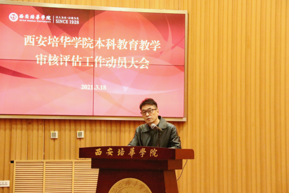 校长李映方作动员讲话。他指出,学校发展已经站在了新的历史起点上,正处在跨越式发展的关键期,全校上下要凝心聚力,务实笃行,为建设推进本科教育高质量发展而努力。针对评建工作,他提出明确要求:一是统一思想,认真学习把握审核评估精神实质。二是从师德师风、教学管理、学生管理、工作作风等方面扎实做好学校审核评估工作。三是要树立全局意识,强化责任落实,处理好学校顶层设计与评建工作的关系,多规合一、一张蓝图。李校长强调,当前和今后一个时期,是我校全面开启高水平民办大学建设新征程的关键时期,希望各单位以勇于担当的责任感和使命感,将审核评估各项目标任务落到实处,写好“十四五”开官之笔。
