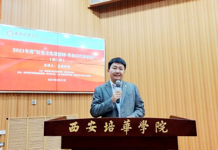 3月31日下午,由陕西省红色文化研究院、西安培华学院、陕西三秦红色文化传播中心举办的“红色文化进校园,革命后代讲家风”系列活动第二讲在西安培华学院长安校区举行,本次活动邀请陕西省红色文化研究院秘书长、陕西三秦儿女红色文化传播中心主任王放为青年学子讲述红色文化。活动由西安培华学院党委宣传部部长柳雨主持,陕西省关工委副主任孙利平、陕西省红色文化研究院及300余名培华师生聆听了报告。