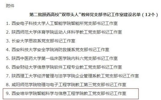 近日,中共陕西省委教育工委公布第二批陕西高校“双带头人”教师党支部书记工作室建设名单。西安培华学院智能科学与信息工程学院教工党支部书记工作室入选第二批陕西高校“双带头人”教师党支部书记工作室建设名单。陕西高校共12个工作室入选。