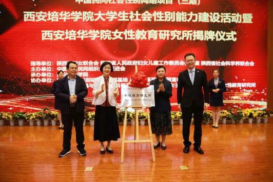 陕西省妇联副巡视员陈小江,陕西省社会科学界联合会党组成员、副主席张雄,西安培华学院理事长姜波,西安培华学院学术学位委员会主席、副校长刘越莲,为“西安培华学院女性教育研究所”揭牌。