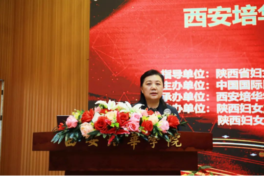 西安培华学院理事长姜波博士在大会上讲话。他指出,培华是一所历史悠久、具有女性教育传统和基因的民办高校,学校历经了93年风雨历程,并于1938年4月成立第一个中共党支部,为开展女性教育和助力中国女性教育发展做出了积极贡献。学校长期致力于女性教育,从女性教育研究到社会公益服务,从女大学生创新创业、就业指导、素质提升等一系列工作入手,提升女性技能,维护女性权益,提升女性地位,打造了女性教育品牌。