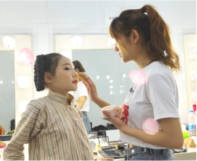 播音与主持艺术专业大二学生任碧莹同学在翟羽佳老师的指导下,也参与了化妆造型工作,把理论所学很好地运用到了实践当中。