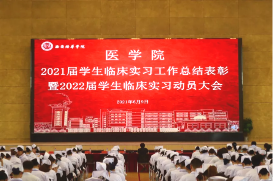 为了进一步推进实习工作的顺利开展,更好地发挥校企合作优势,提高人才培养质量,做好实习和就业工作。2021年6月9日,学校医学院在校体育馆举行2021届学生临床实习工作总结表彰暨2022届学生临床实习动员大会。西安培华学院副校长、医学院院长于国亮,产学研协同创新中心副主任刘斌,医学院常务副院长扈国栋,医学院党委书记兼行政副院长王平安,护理系主任化前珍,医学信息工程专业带头人范云,健康管理专业带头人朱兵,护理系副主任刘芳娥,药学系副主任刘建利,临床与口腔系副主任李晓明等医学院全体教工及医学院优秀实习生代表参加了本次大会。会议由医学院院长助理王菊宁主持。