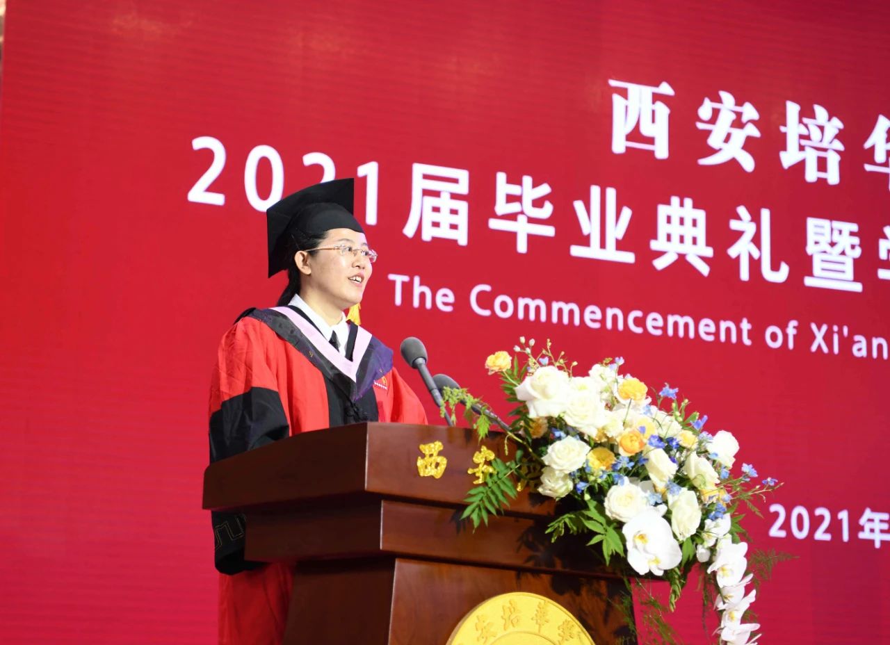 人文与国际教育学院教学副院长赵洁作为教师代表上台发言,她表示毕业不是终点,而是起点,并寄语毕业学子四点人生建议,学会独立、感恩、宽容、管理,以爱人之心善待自己和他人,以自立自强、满怀感恩的生活态度,学会管理,用爱与智慧,不负青春、努力向前,做最好的自己。此去繁花似锦,百年校庆再相遇。