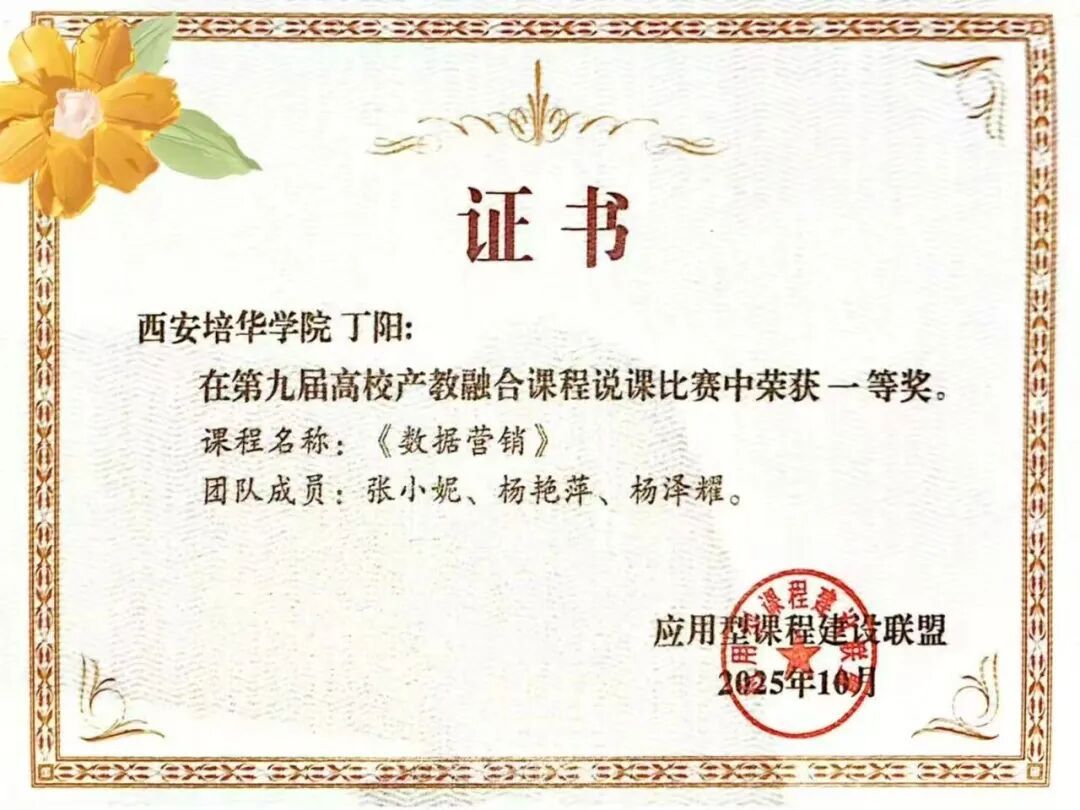 近日,第九届高校产教融合课程说课比赛在长沙举行并落幕。西安培华学院未来产业学院丁阳副院长领衔的《数据营销》课程团队,从全国40余支参赛队伍中脱颖而出,以总分第一的成绩荣获一等奖。
