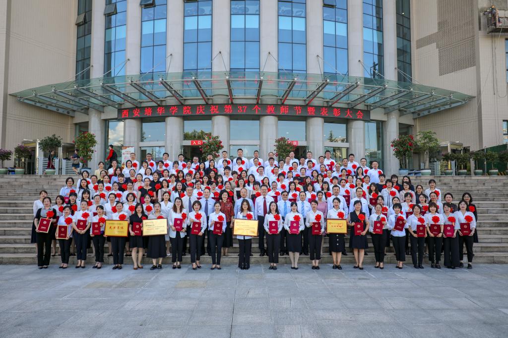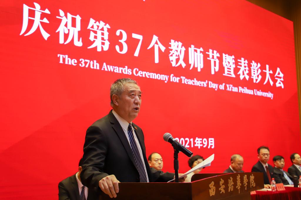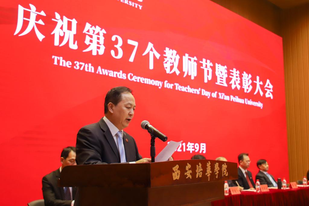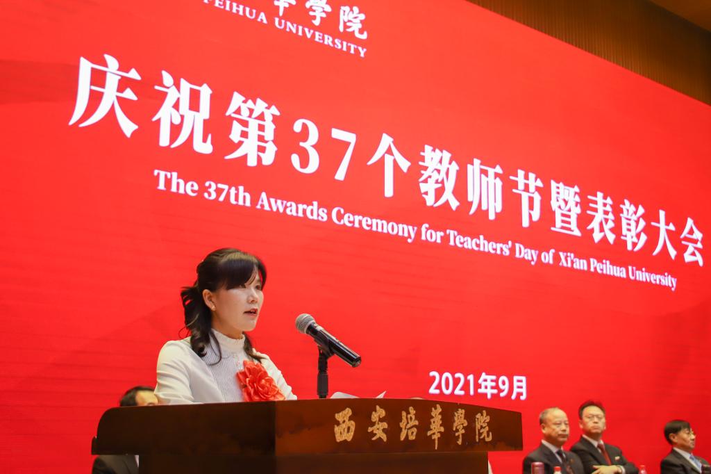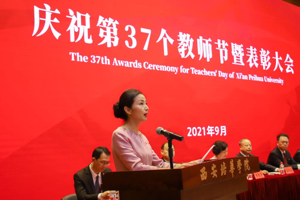 9月9日下午,西安培华学院在维之图书馆报告厅举行2021年庆祝教师节暨表彰大会。全体校级领导,各院(部)、中心负责人、教师代表、辅导员代表近300人参加了会议。