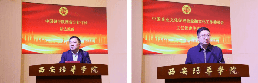 中国银行陕西省分行行长肖达、中国企业文化促进会金融文化工作委员会主任管建华先后致辞。分别从行业发展、金融服务、文化建设等角度,为校企协同育人、金融人才培养建言献策,对西安培华学院在金融教育领域的探索与实践给予高度肯定。