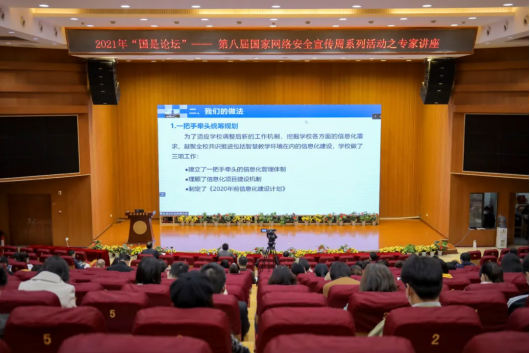 10月27日下午,2021年“国是论坛”——第八届国家网络安全宣传周系列活动之专家讲座在维之图书馆报告厅举行。西安培华学院党委书记罗新远教授及各院系师生代表百余人参加了此次讲座。讲座由党委宣传部部长柳雨主持。