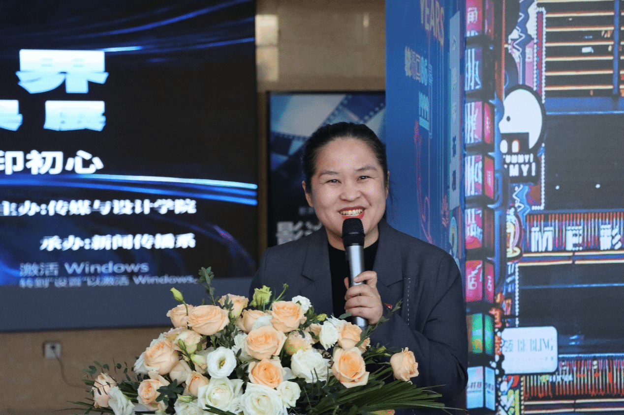 副院长张荣花发表讲话。她指出,传媒教育应紧跟行业趋势,通过项目制教学、真实情境创作和成果展示提升学生的实践能力。本次展出的作品体现了学生在选题敏感度、影像表达力、内容组织和技术运用等方面的进步,呈现出良好的专业基础和创意潜力。