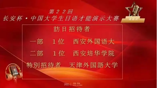 长安杯·中国大学生日语才能演示大赛由中日人文交流大学联盟、中国日语教学研究会、西安外国语大学、日本NPO法人环境研究与教育国际交流协会联合主办。由日本同志社大学、京都外国语大学等高校的教授们担任评委。受疫情影响,本届大会采用线上方式进行。