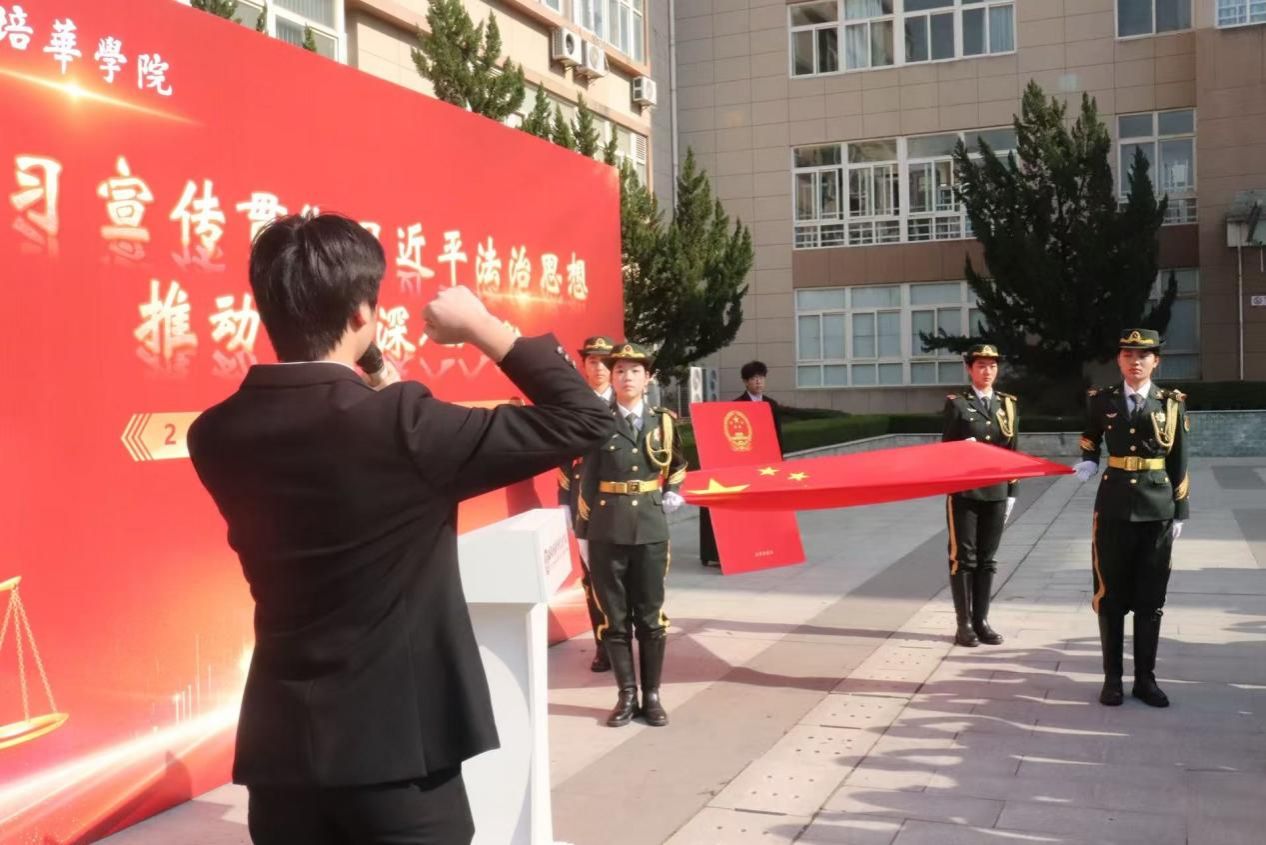在第12个国家宪法日来临之际,为深入学习贯彻习近平法治思想,提高广大学子法治素养,营造浓厚校园法治氛围。12月4日,法学院围绕“学习宣传贯彻习近平法治思想,推动宪法深入人心”的宪法周主题,组织开展宪法晨读、观看宪法直播、宪法宣誓系列活动。