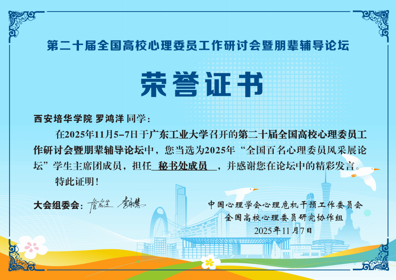 近日,广东工业大学召开的第二十届全国高校心理委员工作研讨会暨朋辈辅导论坛上传来喜讯,西安培华学院会计与金融学院罗鸿洋同学凭借扎实的心理工作能力、积极的责任担当,成功当选第二十届全国心理委员论坛秘书处成员。