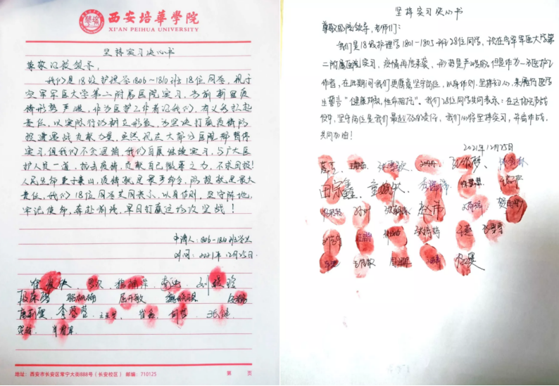 护理学1801-1805班实习同学在《坚持实习决心书》中写到:“疫情再度来袭,形势是严峻的,但是作为一名医护工作者,在此期间我们更愿意坚守岗位,以身作则、坚持初心,来履行医学生'健康所系,性命相托'的誓言。我们共同表示:在这场无声战役中,坚守岗位是我们最起码的责任,我们必将坚持实习,并肩作战,共同加油!”