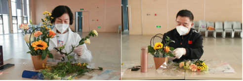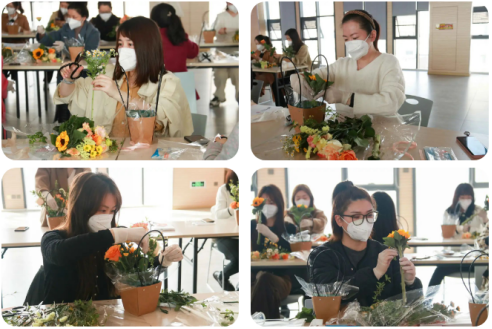 花艺师从插花风格、花卉特点等方面进行了讲解,并带领老师们进行插花活动,现场花香四溢,笑意盈盈。