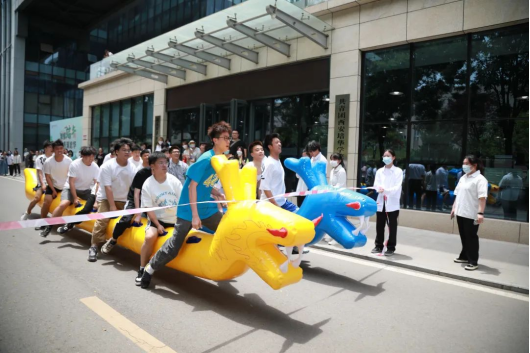 呐喊中齐头并进,第一个游戏是旱地龙舟,选手们以学院组队,十人组队、共同配合,声声呐喊中,游园会的气氛推向了高潮。
