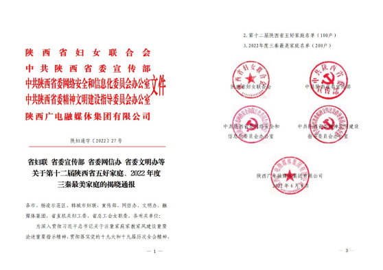 陕妇通字〔2022〕27号三秦最美家庭揭晓通报