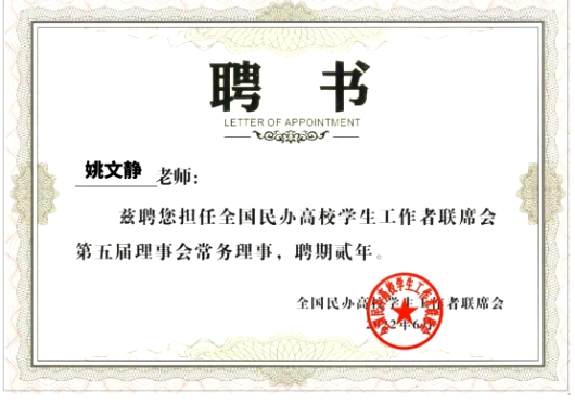 大会宣读并表决通过了《“全国民办高校学生工作者联席会”第五届理事会常务理事名单》,我校党委副书记、副校长姚文静当选为全国民办高校学生工作者联席会第五届理事会常务理事。