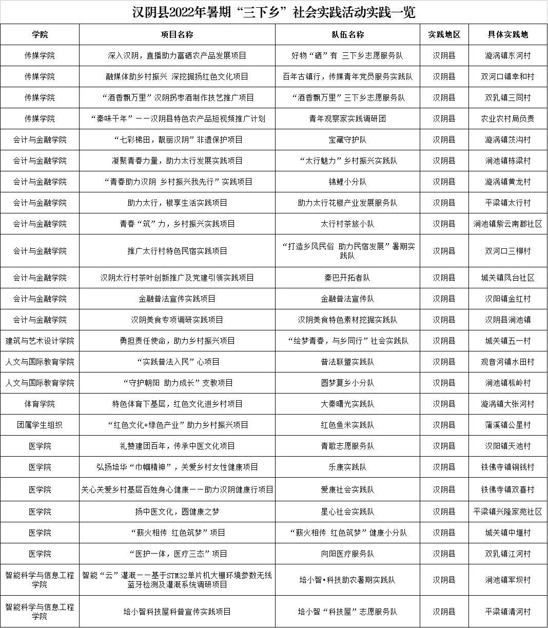 2022年,为积极助力乡村振兴,充分发挥校地联动实践育人的重要作用,在安康团市委、汉阴县委县政府、乡村振兴局、团县委、县妇联等有关部门的大力支持下,我校围绕理论宣讲、法律科普、科技兴农、乡村健康、爱心支教、产业调研等实践方向,成立了西安培华学院青春聚力乡村振兴暑期“三下乡”汉阴专项实践团,下设28 支实践服务队,实践足迹遍布汉阴县的13个乡镇、28个村,服务村民近万人。在蓝天白云和绿水青山中,也留下了许多培华青年难忘的青春印迹。