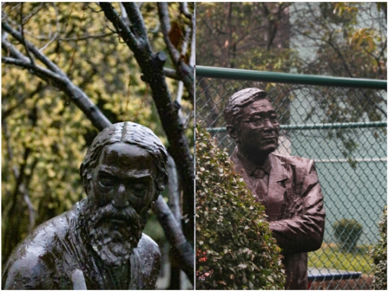校园里点缀的雕像,在雨的烘托下,深沉、沉稳的气息,也愈发明显。