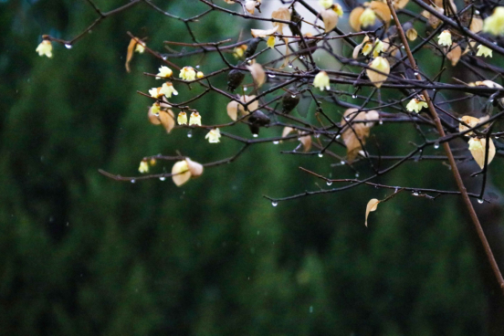 随风而至,滋润万物,无意讨好,唯有奉献。春雨中,万物生长,生命萌发,而腊梅也在雨中“肆意”绽放,洗尽铅华。
