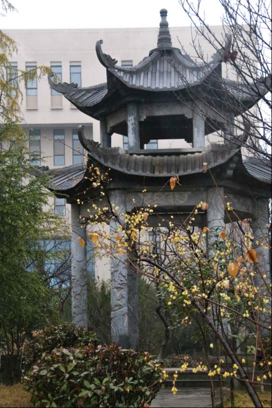 凉亭、青瓦,坐落在绿植环绕间。春风过、春雨来,也庇佑行人西复东。