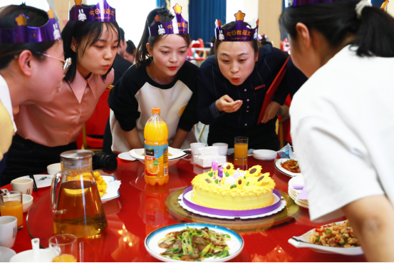 一支支燃烧着永远18岁的生日蜡烛映出教职工们幸福的笑脸,伴随着欢快的生日歌,大家许下美好的生日愿望,校领导们为寿星们分切饱含祝福的生日蛋糕。
