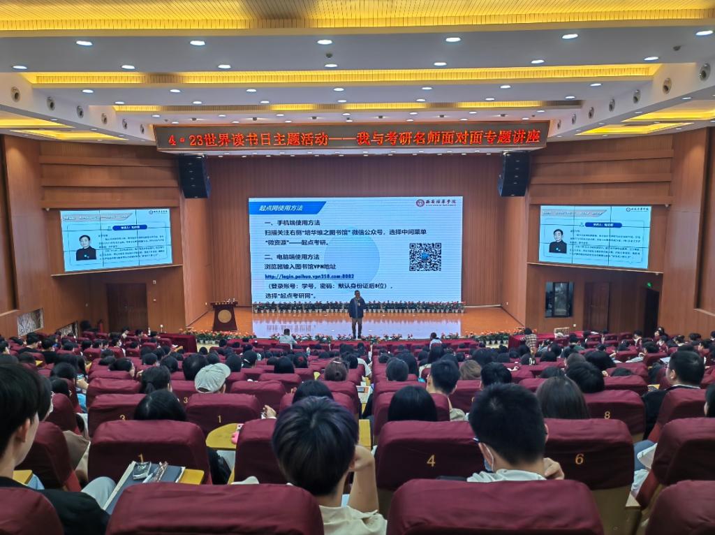 为加强学生对考研政策的了解,提高考研备考方法与技巧,树立考研信心,4月17日晚,图书馆联合起点考研网数据库在报告厅举办“我与考研名师面对面——决胜考研 圆梦青春”专题讲座。本次讲座由起点考研网特聘讲师毛访蘅主讲,全校近500人通过线上预约参加。
