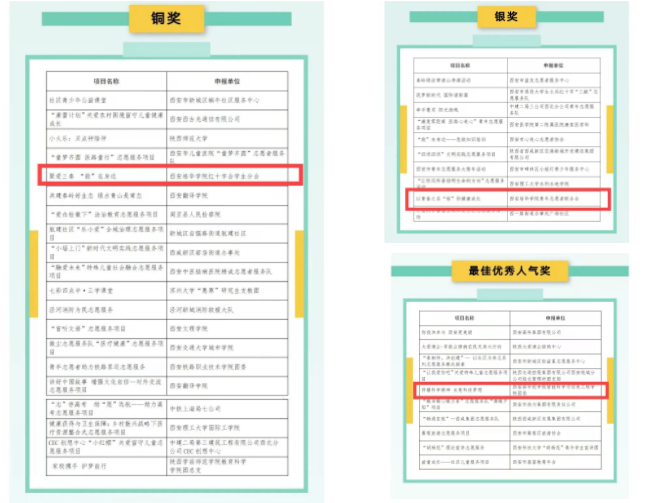由共青团西安市委、西安市民政局主办,西安市青年志愿者行动指导中心、西安市退役军人服务中心、西安志愿者协会、公益西安承办的西安市首届青年志愿服务项目大赛终评落下帷幕,经前期的项目申报、项目初审、线上展示、路演展示和答辩技巧培训及专家评审会等环节,我校青年志愿者联合会申报的《以青春之名 “培”你健康成长》、红十字会学生分会申报的《聚爱三秦 “救”在身边》和智能科学与信息工程学院团委申报的《传播科学精神 点亮科技梦想》分别斩获银奖、铜奖、最佳优秀人气奖。