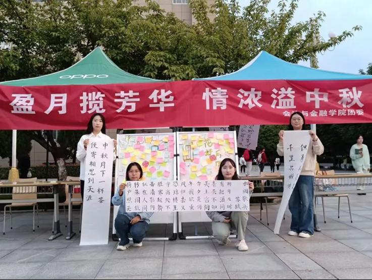 会计与金融学院团委在丰园西广场开展主题为“盈月揽芳华,情浓溢中秋”书写中秋活动,通过书法的形式,以中秋佳节相关诗词来表达同学们对中秋的美好寄托,生动有趣地再现传统文化的魅力,弘扬中国传统文化。