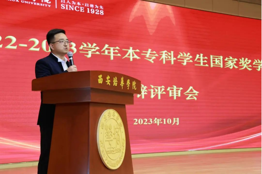 党委学工部副部长、学生资助管理中心主任姚斌汇报2022-2023学年国家奖学金评审工作开展情况。他讲到国家奖学金是我校资助育人工作的重要组成部分,学校围绕立德树人根本任务,持续推进改革实践,通过国奖评审公开答辩、邮寄喜报、建立“青春榜样”宣讲团、线上线下媒体平台榜样事迹展播、学霸分享会等形式,凝聚朋辈引领合力,发挥国奖学生榜样示范作用,激励广大同学汲取榜样力量,奋发向上,逐梦前行。
