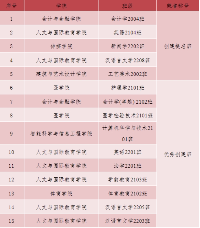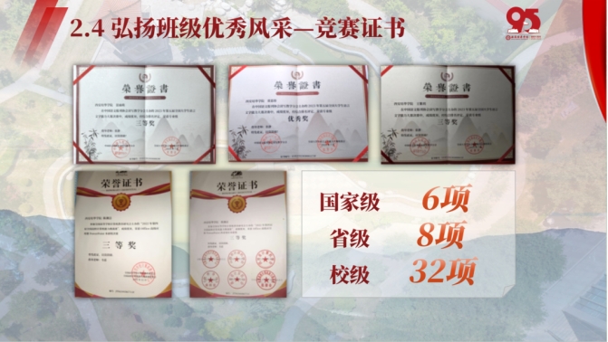 人文与国际教育学院英语2104班坚持“党—团—班”一体化机制建设,一个思想、三向同归、一个指导、四个建设,创建过程中,全班普通话水平考试通过率100%,英语四级通过率97%。科研竞赛中荣获国际级项目2项,省级项目4项,校级项目6项;其余荣誉国家级19项,省级6项,校级25项。在创建中成长,在创建中奋进,做讲好中国故事的践行者、讲述者、传播者。