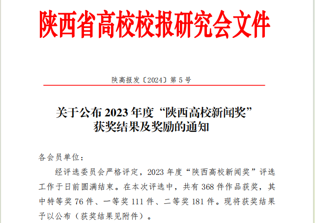 据悉,陕西高校新闻奖”是由陕西省高校校报研究会主持评选的全省高校新闻系统唯一的学术性评奖,评选范围涵盖消息、通讯、言论、新闻图片、新闻专栏、版面等六大类。