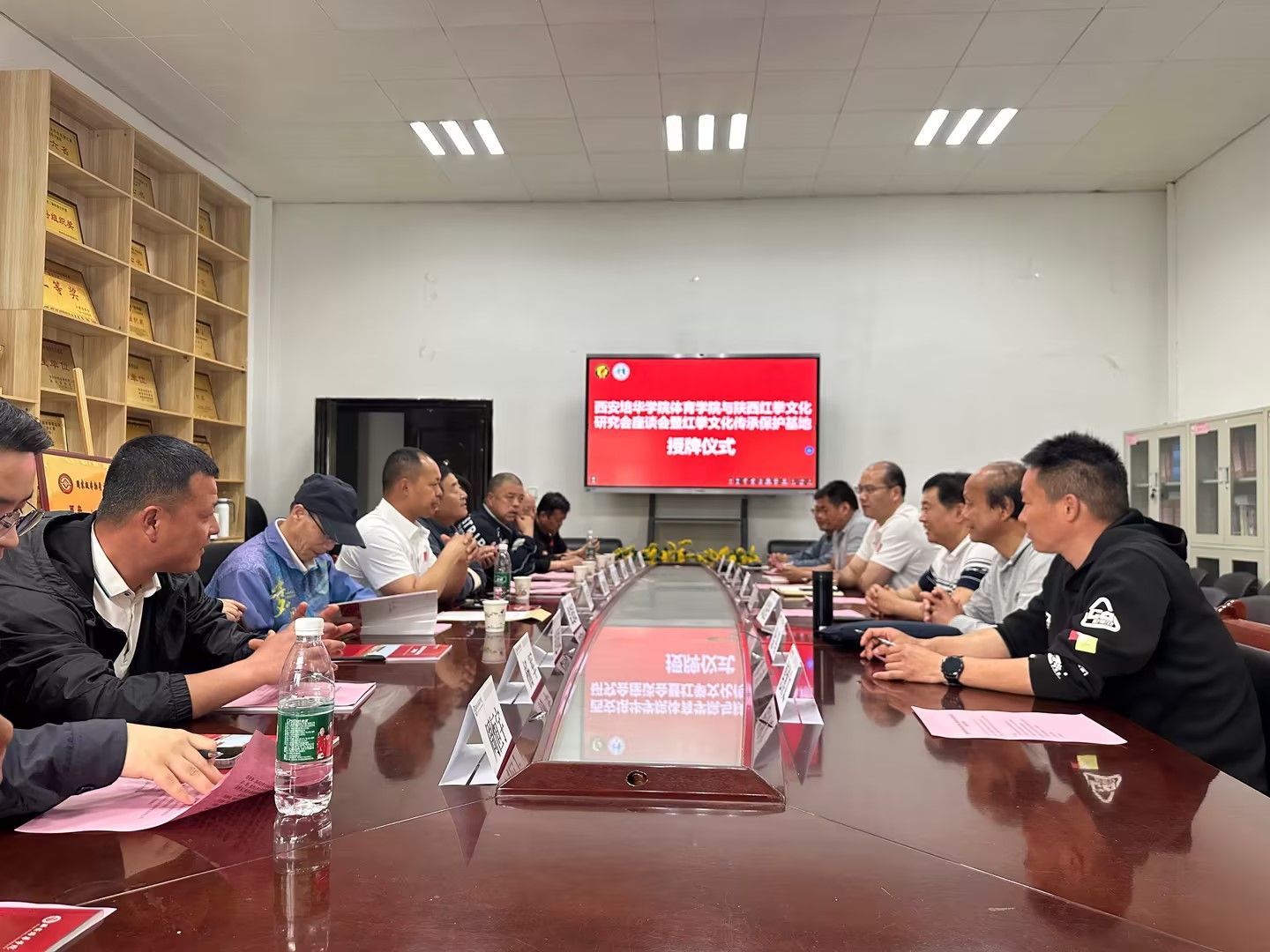 陕西红拳文化研究会会长、红拳国家级代表性传承人邵智勇,陕西红拳文化研究会秘书长、红拳省级代表性传承人田琨,陕西红拳文化研究会监事会主席杨朝华,陕西红拳文化研究会常务副会长、西安外国语大学红拳高校科研保护推广中心主任卢佳,陕西红拳文化研究会副会长、红拳省级代表性传承人党选民,陕西红拳文化研究会副会长孙顺喜、赵国民,陕西红拳文化研究会办公室主任蔡永红,陕西红拳文化研究会副秘书长、马场小学校长杨军,陕西日报记者周恒宇;西安培华学院监事会主席、校工会主席、校体育工作委员会主任徐国富,西安培华学院体育学院院长王志强,体育学院党总支书记、行政副院长马德厚等人出席本次仪式。